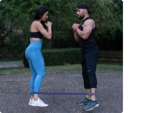 Așează banda sub picioare și prinde capetele la nivelul umerilor. Efectuează genuflexiuni pentru a lucra coapsele și fesierii.