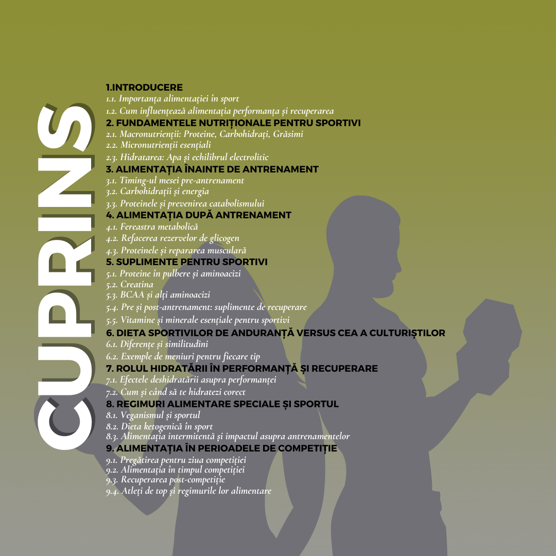 Este ghidul pentru atleții care doresc să își optimizeze performanța prin alimentație. Acest manual cuprinzător explorează cum pot diferitele grupuri de alimente să sprijine efortul fizic intens, să accelereze recuperarea după antrenament și să crească rezistența generală.